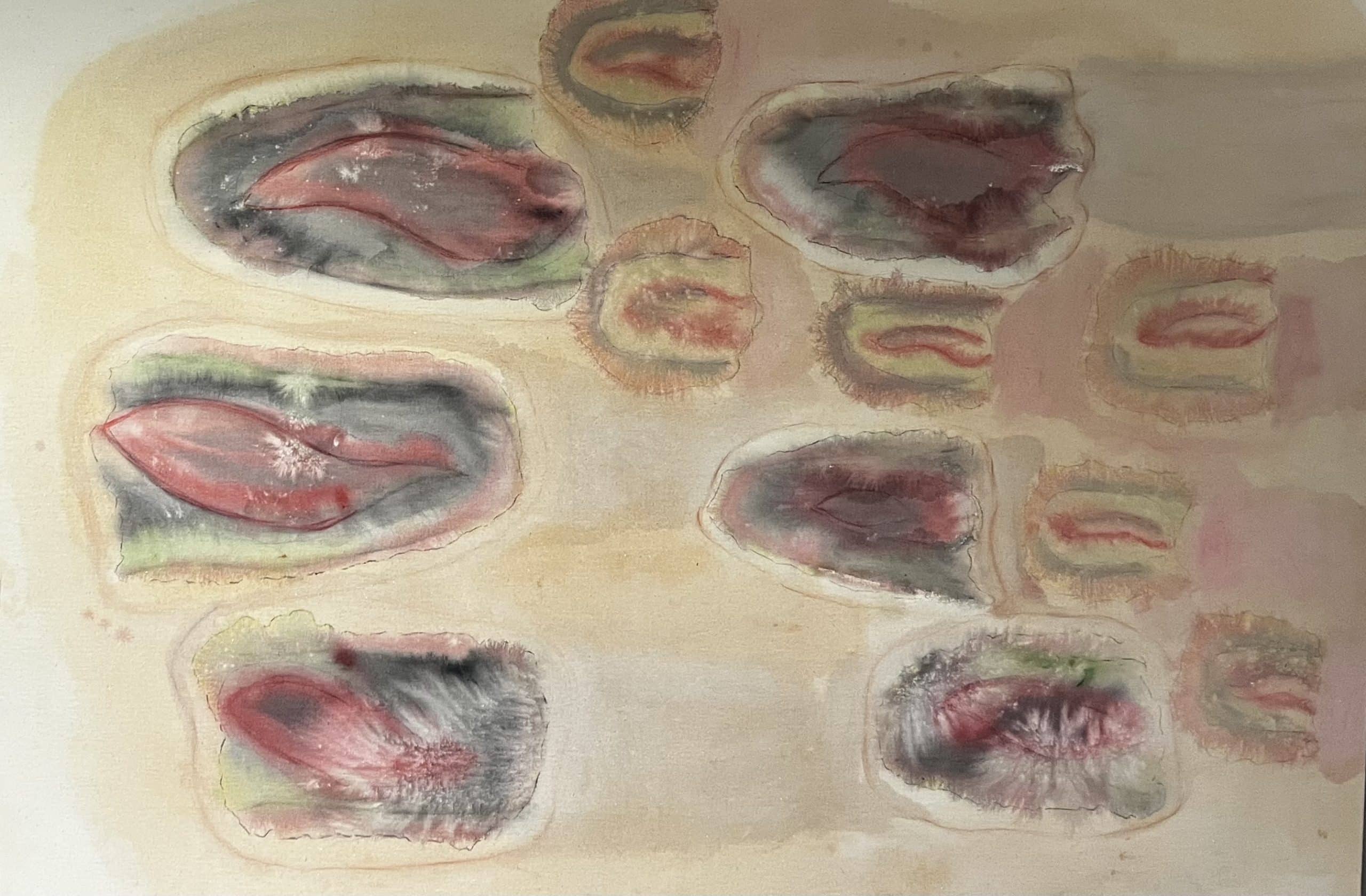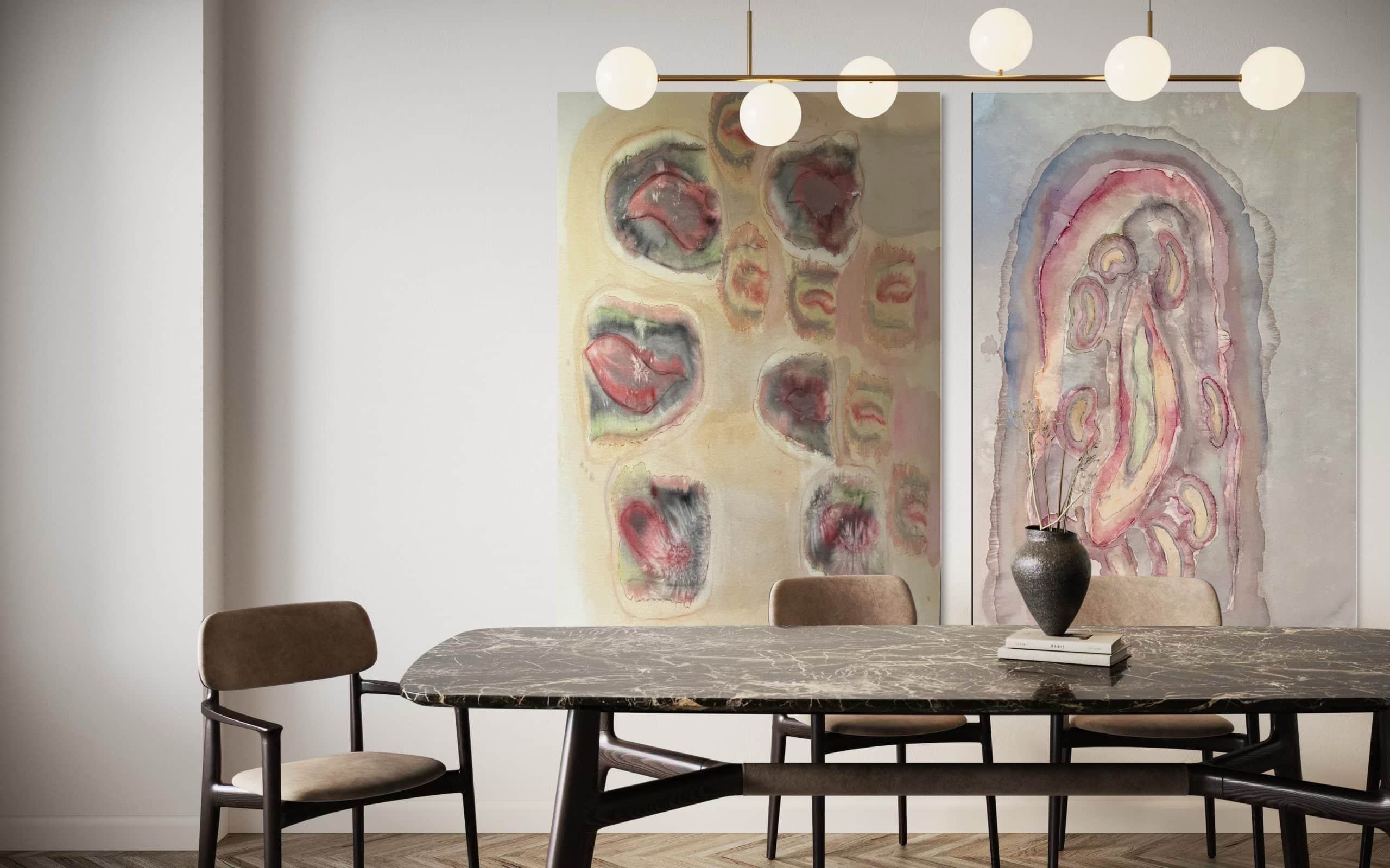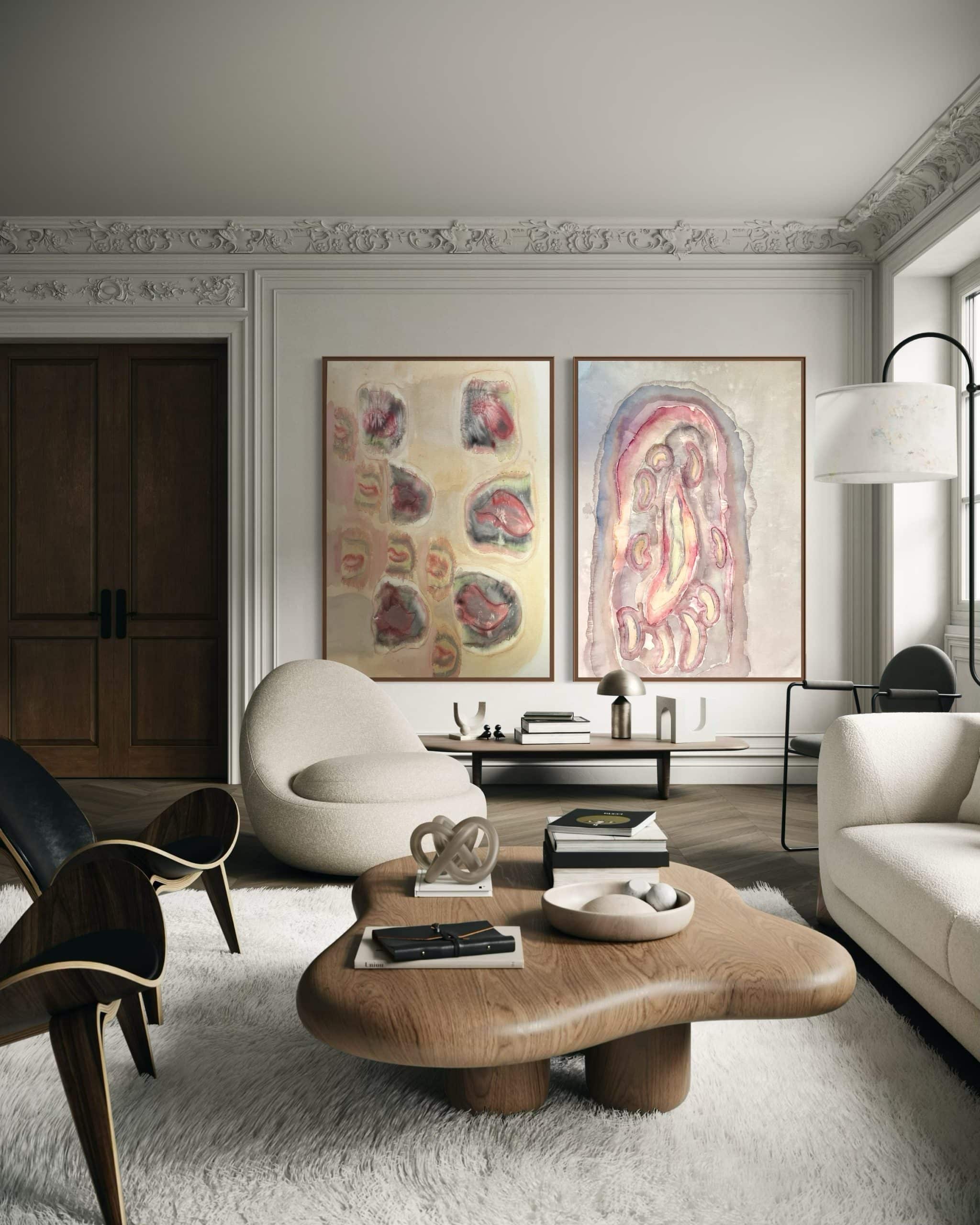 צורות אורגניות מינימליסטיות מרחפות בחלל שקט כסימנים הפתוחים לפרשנות של מחשבות מעולמי הפנימי.