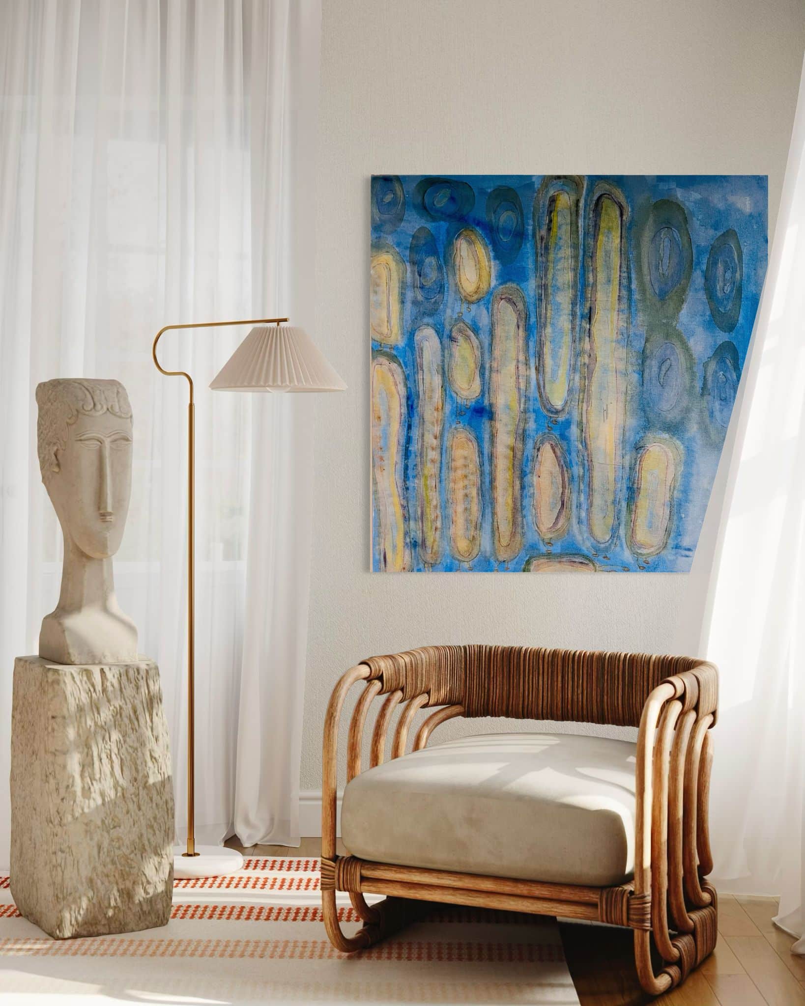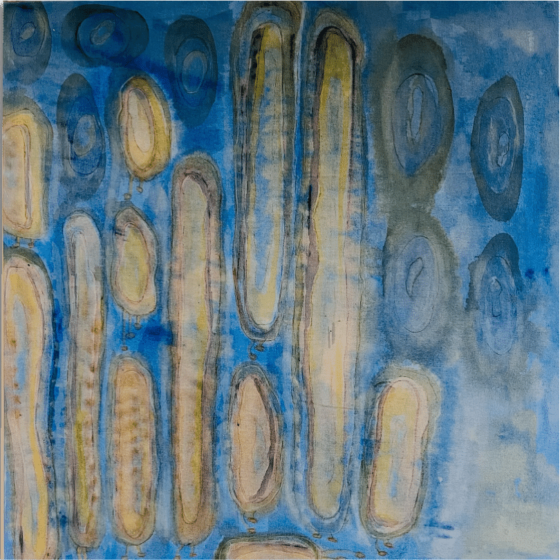 זהו ציור מופשט בגוונים קרים של כחול וטורקיז, המדמה מרחב מימי שקט ועמוק. על פני הרקע הכחול צפים ונשזרים אלמנטים אליפטיים ואנכיים בגווני חול, ירקרק ואפור, המזכירים פעימות, אבנים שחוקות או תנועות איטיות מתחת לפני המים. השכבות השקופות והמריחות הרכות יוצרות תחושה של זרימה, נשימה וקצב פנימי, כמו הד עדין של תנועה מתמשכת. הציור משדר רוגע והתבוננות פנימית, ומזמין את הצופה לשהות בין שקט לתנועה, בין עומק לאור