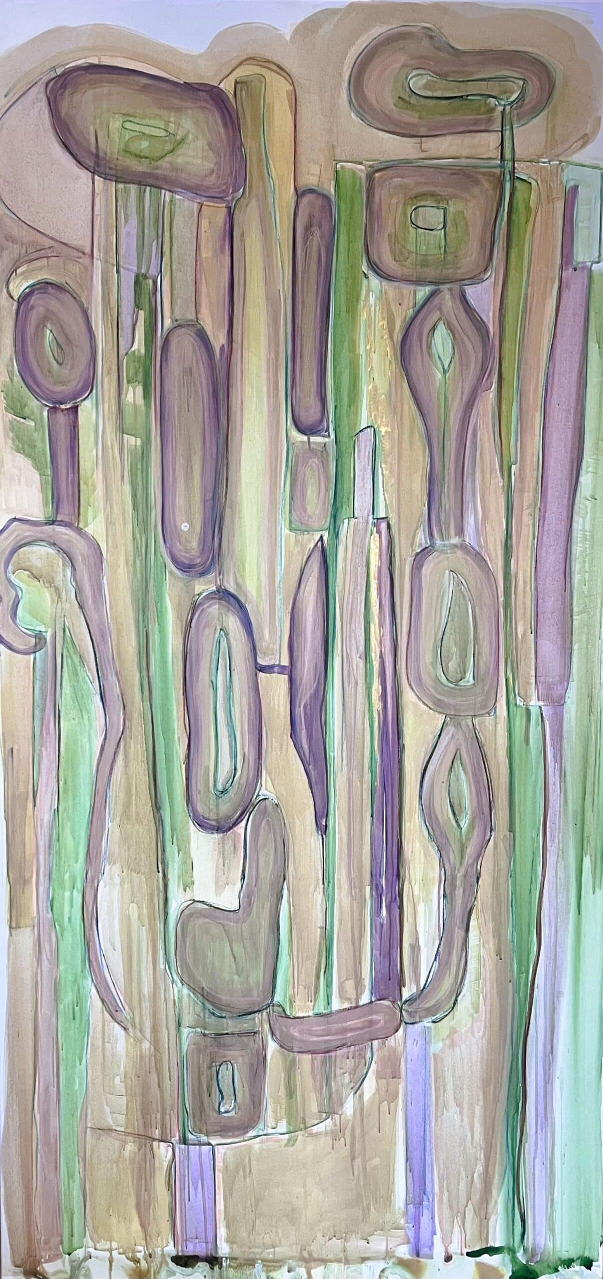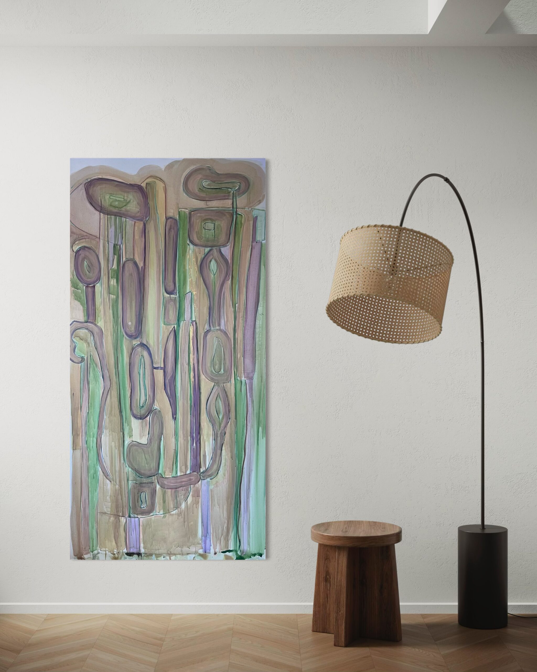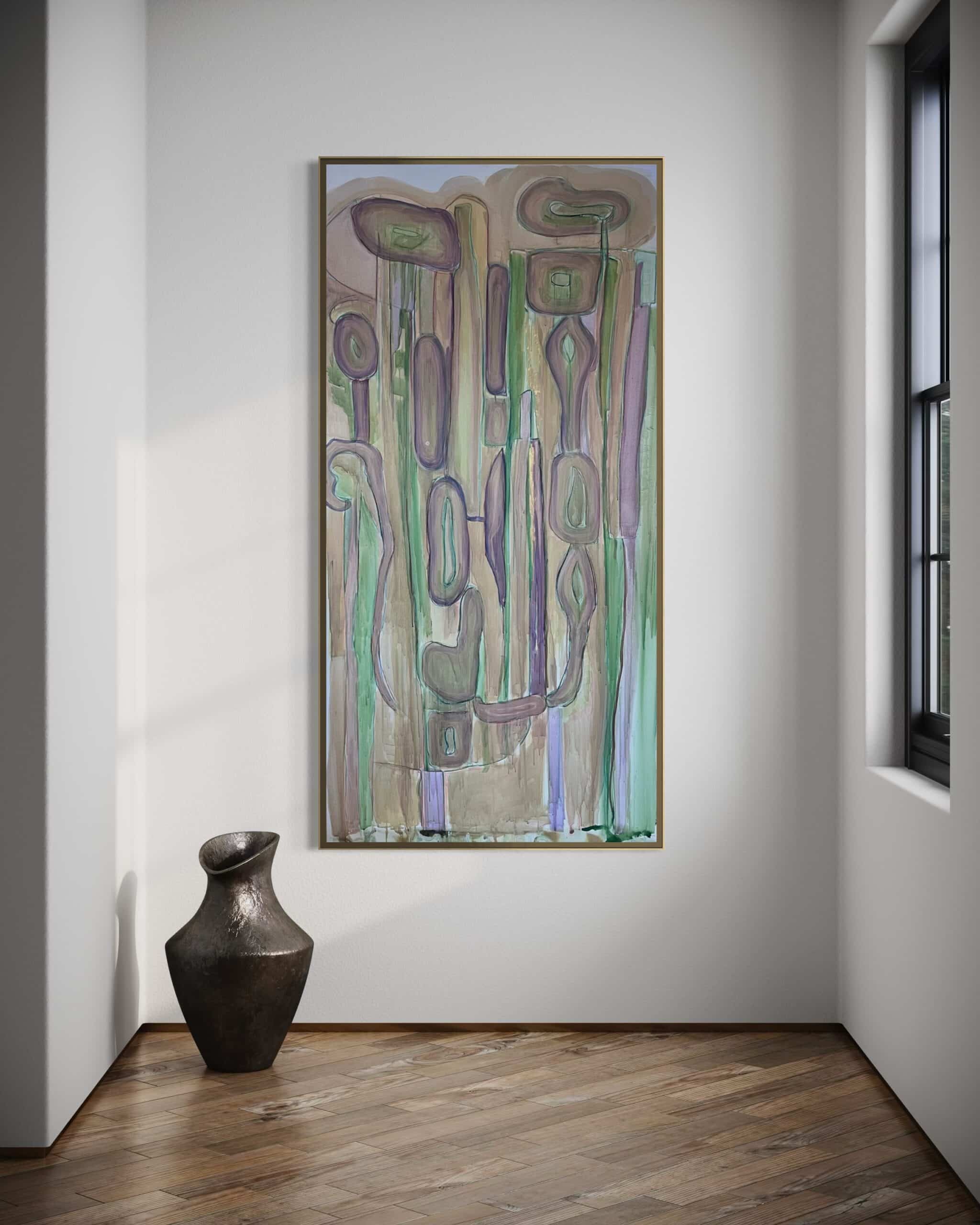 טכניקה שמשלבת אקריליק בסגנון צבעי מים וגירים, על בד קנבס.